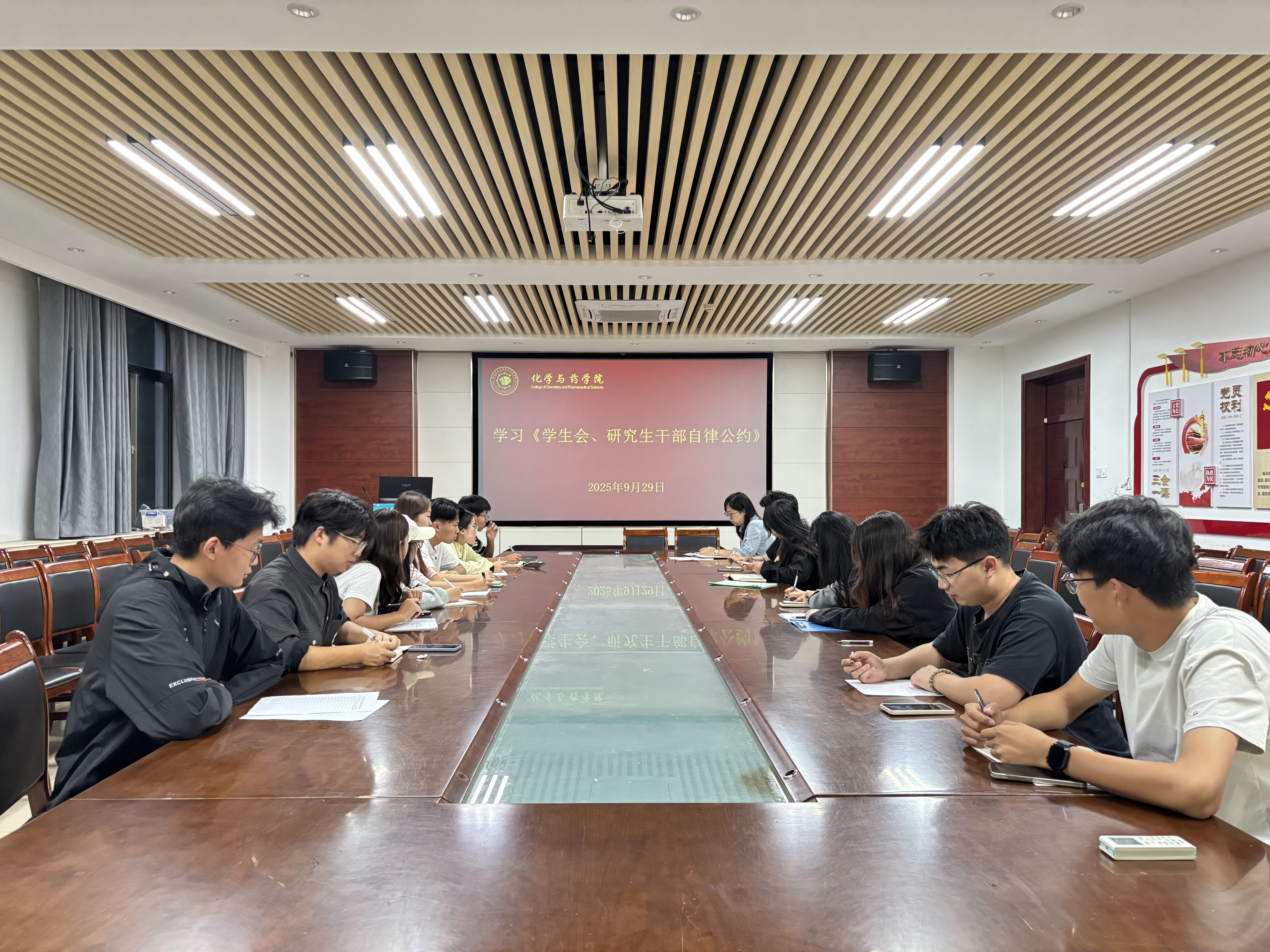 会上,赵莹带领全体学生干部仔细研读《学生会、研究生干部自律公约》,并结合学生工作内容提出两点要求,一是学生干部应严格遵守公约条例,恪守学生本分,强化责任意识,确保工作开展的合理性与方式方法的准确性;二是学生会成员要廉洁自律,努力提升履职能力,始终牢记服务同学的宗旨,真正做到从同学中来、到同学中去,切实发挥桥梁纽带作用。