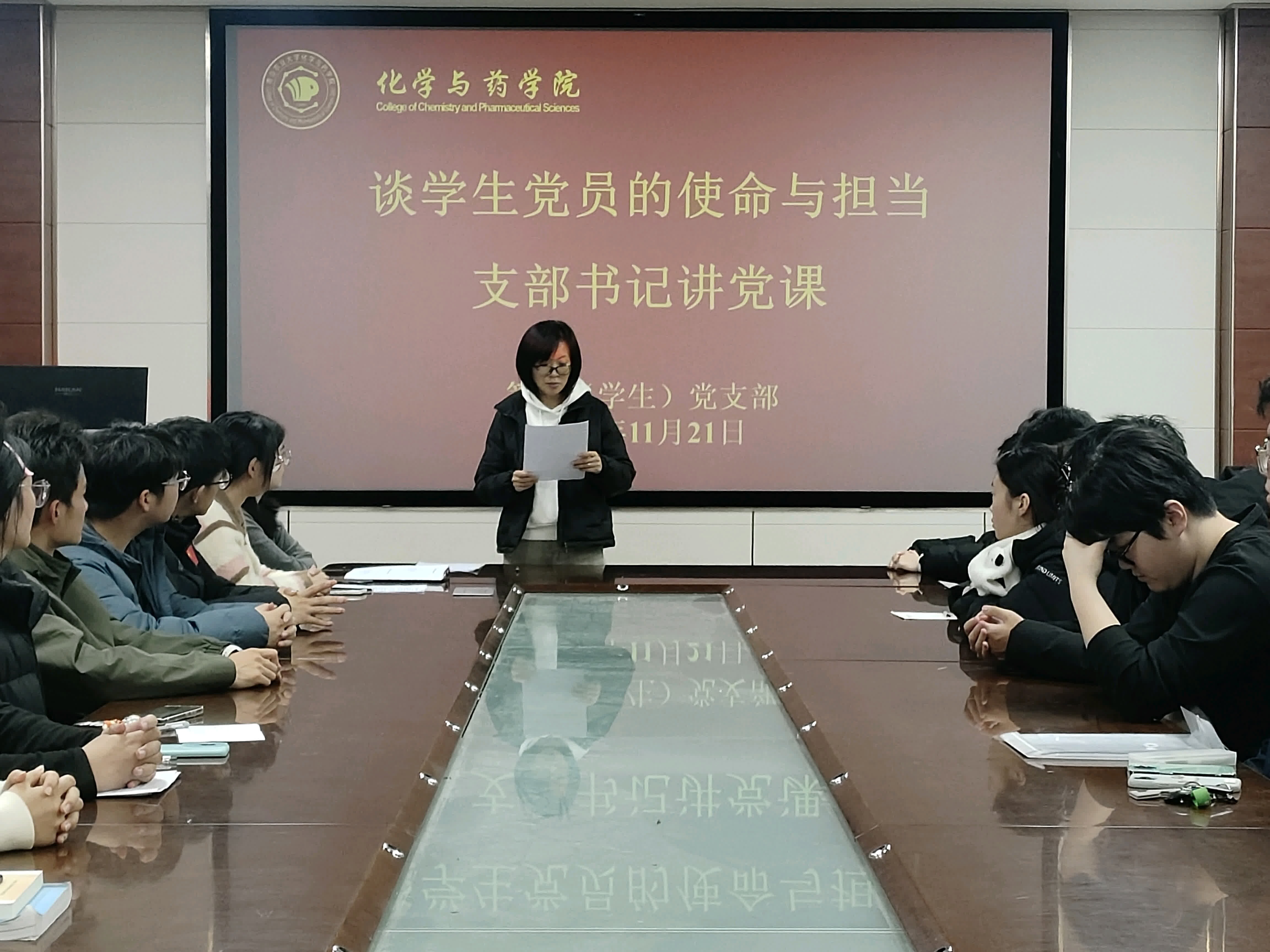 为深入学习贯彻党的二十届四中全会精神,强化学生党员的责任意识与先锋模范作用,11月21日,化学与药学院第五(学生)党支部在化学楼207会议室组织开展“谈学生党员的使命与担当”专题党课。第五党支部书记黄海红主讲,党支部全体党员参加学习。